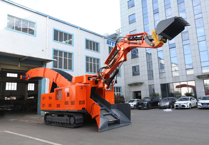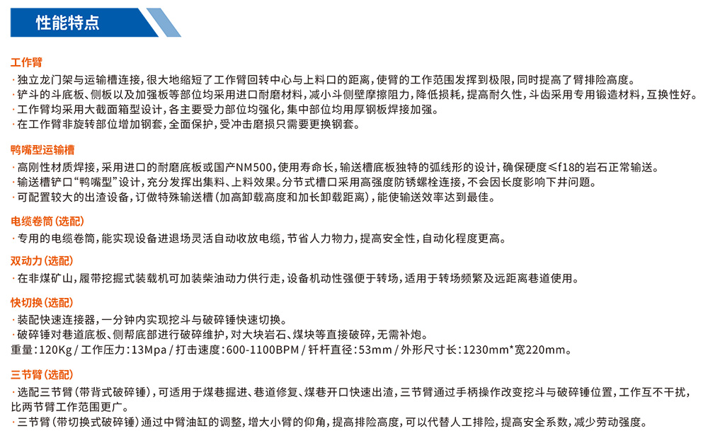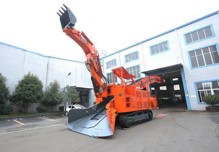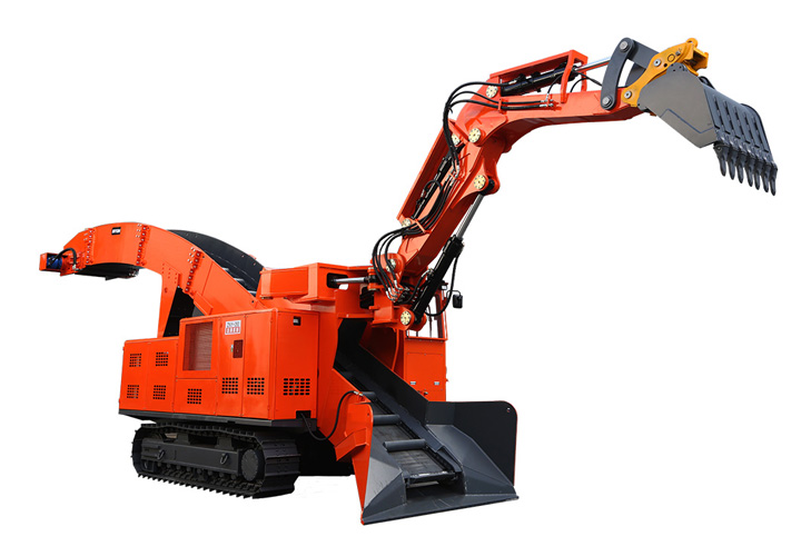 履帶挖掘式裝載機是一種連續生產(chǎn)的高效率出渣設備。主要用于鐵路、公路隧道及煤礦引水洞、國防洞窟掘進(jìn)施工中裝載作業(yè)。本機靠履帶推進(jìn)扒取巖石,通過(guò)反鏟機構扒臂扒取遠處的巖石進(jìn)自身的刮板輸送機,輸送機從尾部將巖石卸入自卸汽車(chē)、梭式礦車(chē)、側卸式礦車(chē)、皮帶機等其它轉載設備。