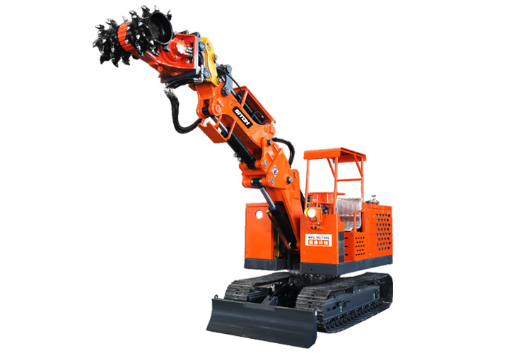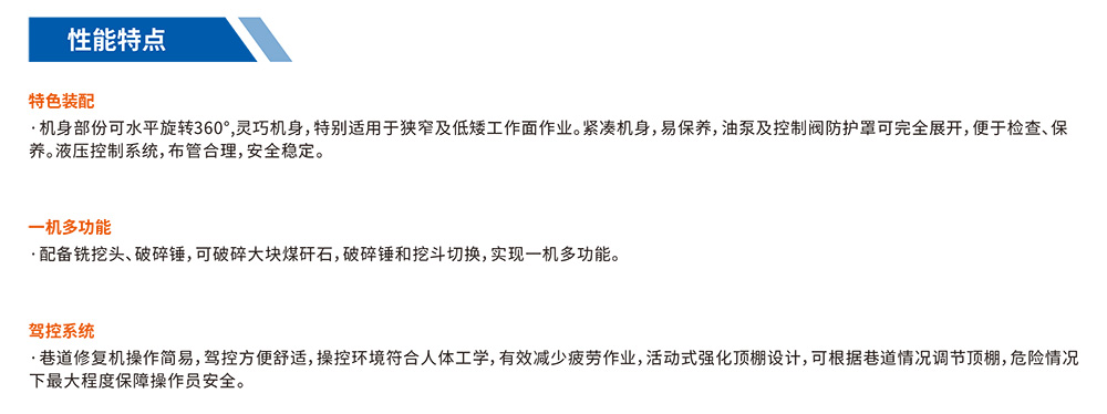 該設備上半部分可水平旋轉360°,可以滿(mǎn)足銑挖、挖掘、側向開(kāi)口、破巖、裝車(chē)、起吊等各項動(dòng)作要求;實(shí)現挖掘水溝、開(kāi)口側巷道、破巖、清理浮煤、平整巷道及小型配件吊裝等多種功能。該開(kāi)口機可配備液壓銑挖機、液壓破碎錘,破碎硬度較高的大塊巖石。煤礦用巷道修復機為模塊化設計,具有互換性,本機動(dòng)力單一,整機功率僅90kw,全部動(dòng)力集中在一個(gè)動(dòng)力模塊;由一個(gè)電機、主泵、一聯(lián)輔泵組成。液壓系統采用中高壓、發(fā)熱相對較低,并配有風(fēng)冷系統,主要動(dòng)作采用先導閥控制,操作簡(jiǎn)便,工作平穩無(wú)沖擊,系統運行穩定可靠性高。